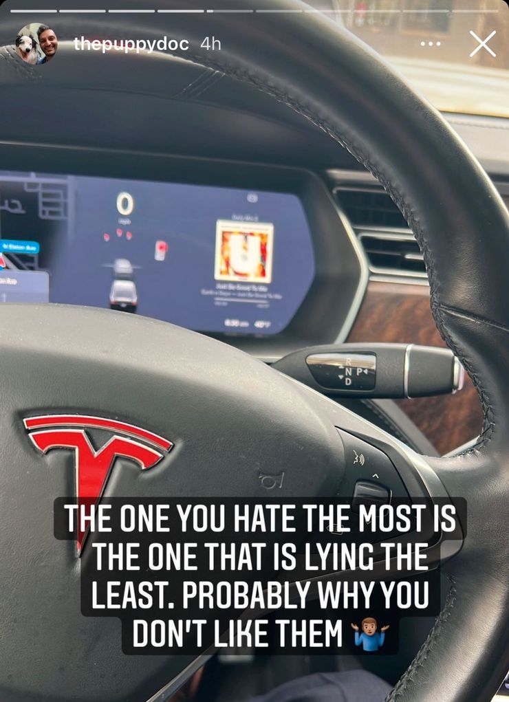Ahora, Shake ha optado por seguir empujando el sobre cuando se trata de su diatriba en las redes sociales. Como se ve en las capturas de pantalla a continuación, Shake compartió una historia de Instagram dentro de su automóvil Tesla con la leyenda: “El que más odias es el que menos miente. Probablemente por eso no te gustan”. Luego compartió una historia de Instagram posterior que decía: “Todas estas disculpas perfectas son trucos publicitarios de personas que se preocupan lo suficiente por su apariencia como para mentir rotundamente. Voy a jugar ese juego. Nunca”. Estas publicaciones muy dramáticas de Shake sugieren que él cree que algunos de sus compañeros de reparto están mintiendo al El amor es ciego ventiladores para verse mejor.