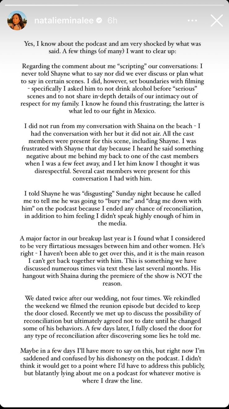 Shayne trató de decir que Natalie no era completamente inocente y explicó: “[Natalie and I] estábamos teniendo una conversación ayer, y… ella me llama un ser humano repugnante, todo este tipo de cosas.” Incluso agregando, “Todavía no puede superar todo el asunto de Shaina.“Refiriéndose a la relación de Shayne y Shaina tanto dentro como fuera de la pantalla. Como los fanáticos han especulado si los dos alguna vez salieron después de que terminó la filmación, y aunque la reunión no dio respuestas, la aprensión de Shayne por responder la pregunta sí lo hizo. Shayne pasó a hacer una una gran cantidad de reclamos y su relación. Natalie respondió rápidamente con una publicación larga en su historia de Instagram en la que dice: “Salimos dos veces después de nuestra boda, no cuatro veces. Recientemente nos reunimos para discutir la posibilidad de reconciliación, pero finalmente acordamos no salir hasta que cambiara algunos de sus comportamientos.