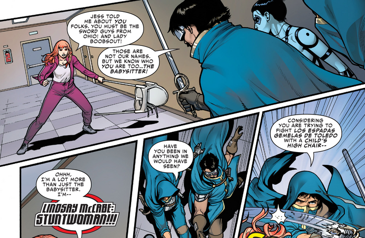 En Mujer Araña #21 – escrito por Karla Pacheco con arte de Pere Perez, color de Frank D’Armata y letras de Travis Lanham – Jessica Drew se encuentra cara a cara con el Anti-Arach9 y está realmente sorprendida al saber que sus pícaros tienen “marca” – sobre todo porque apenas reconoce a algunos de ellos. Spider-Woman siempre ha sido sarcástica, irreverente y capaz de burlarse de sí misma, por lo que no sorprende cuando reconoce que todos sus villanos son bastante perdedores, incluida Lady Bullseye. Al tratar de recordar los nombres de sus enemigos, que la atacan todos a la vez, se refiere a Lady Bullseye como “Señora Tetona”, y en la página siguiente, su amiga cercana Lindsay McCabe también la llama por ese nombre, lo que significa que Jessica está difundiendo su nombre inapropiado para Lady Bullseye.