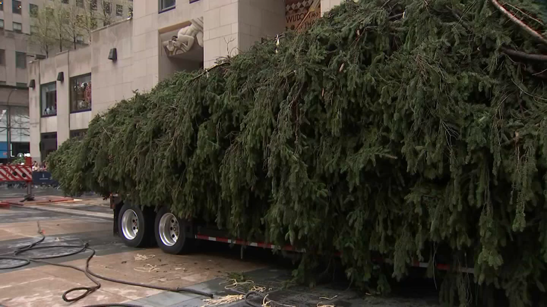El árbol noruego de 82 pies de alto, 50 pies de ancho y 14 toneladas se transportó en un camión de plataforma para llegar el sábado a su destino en el Rockefeller Center. El árbol, que se cree que tiene entre 85 y 90 años, fue donado por la familia Lebowitz de Glen Falls.