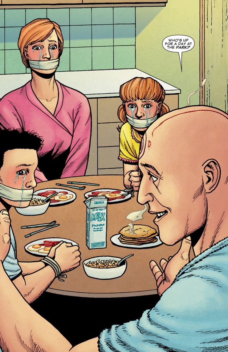 Como si la versión original de Bullseye no fuera lo suficientemente aterradora, la versión que contrata Kingpin en Castigador MAX es puro combustible de pesadilla. Bullseye hace su primera aparición en la serie limitada en Castigador MAX # 5 por Jason Aaron y Steve Dillon, pero no muestra su naturaleza sádica hasta que acepta el trabajo de matar a Frank Castle. Para comprender mejor al hombre que fue contratado para matar, Bullseye decidió que quería vivir una vida similar a la que Frank Castle llevó antes de que su familia le fuera trágicamente arrebatada, solo que completamente corrompida en todos los sentidos. Bullseye secuestró a varias familias, mató a los maridos y los usó como si fueran su propia esposa e hijos antes de matarlos también para fabricar la sensación de tener y luego perder seres queridos tal como lo hizo Punisher.