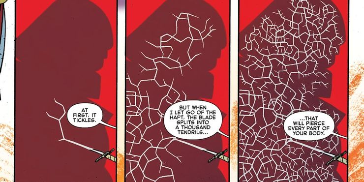 Después de que Amaryllis apuñala a Terrax, ella explica de qué es capaz el arma, mientras que la inquietante obra de arte revela lo que el arma le está haciendo al cuerpo de Terrax. “Al principio, hace cosquillas,” ella dice. “Pero cuando suelto el eje, la hoja se divide en mil zarcillos que perforarán cada parte de tu cuerpo.A Terrax se le da un panel para comprender lo que le está sucediendo, antes de que diminutas agujas salgan de debajo de su piel en el siguiente. Se ve tan horrible como suena, y poco después el antiguo heraldo de Galactus cae al suelo. , muerto.