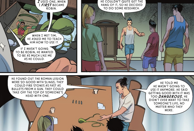 El hecho de que Tim, que es conocido por tener una moral fuerte, decidiera renunciar a la honda por su cuenta habla más de sus propios sentimientos en contra de matar, y refleja un deseo que Bruce sin duda encontraría admirable. Con suerte, este hecho actuará como una pista para el resto de la familia, ya que se reveló que la reciente declaración de Tim de que sus antiguos villanos deberían morir fue obra de Jenny Wren, quien había tomado su lugar disfrazada. Lo que hombre murciélagorazón de Tim Drake para prohibir las armas entre sus aliados, Robin está profundamente preocupado por salvaguardar toda la vida, y ese hecho puede ser lo único que puede salvar su vida mientras Jenny Wren lleva a cabo sus planes.