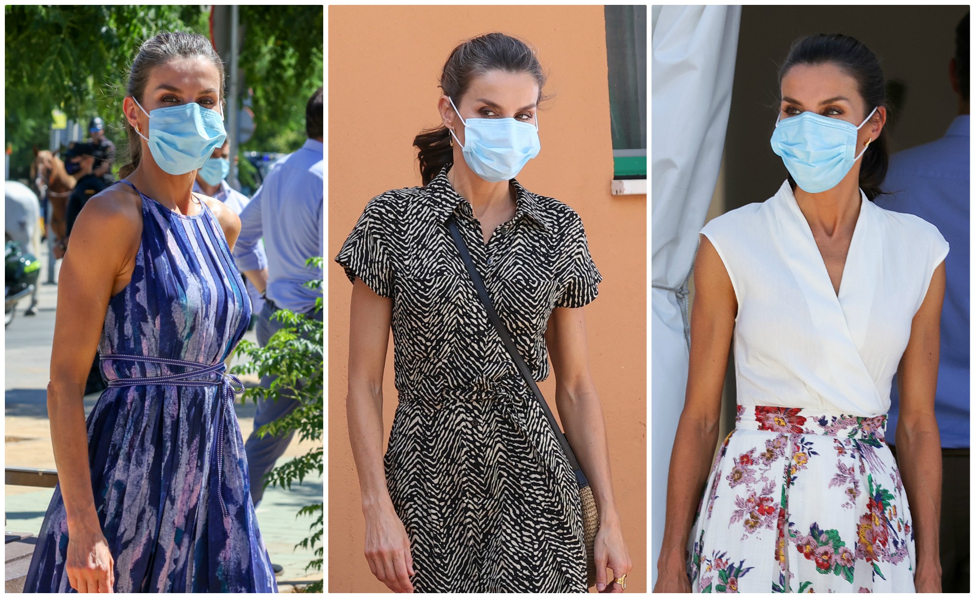 Los reyes Felipe y Letizia están visitando diferentes ciudades españolas dentro del marco de la gira por el país que iniciaron el pasado 23 de junio con motivo de la finalización del estado de alarma por la pandemia del coronavirus y como respaldo al relanzamiento del turismo. Antes de que acabe el mes de julio pasarán por las 17 comunidades autónomas. En todas sus paradas doña Letizia ha buscado transmitir con su estilismo un mensaje de austeridad y de apoyo a las marcas nacionales, luciendo un armario muy económico y casi todo de firmas españolas.Primera parada: CanariasEn su viaje a Gran Canaria y Tenerife, la Reina estrenó un vestido aguamarina con escote en V y estampado de lunares. Se trata de un diseño de Zara cuyo precio original era de 45,99 euros pero que está rebajado a 25,99 euros. También ha estrenado alpargatas, unas tono crudo y atadas con lazada cuyo precio ronda los 65 euros de la firma riojana Macarena Shoes, en la que doña Letizia parece haber encontrado un sello de confianza.Segunda parada: Palma de MallorcaEn esta ocasión la reina optó por un vestido muy vistoso de la marca francesa Maje dominado por un intenso color verde, con estampado floral y cintura fruncida. Un estilismo reciclado, eso sí, que ya estrenó el año pasado en julio de 2019, en la clausura de su agenda oficial y que, como hizo entonces, ha vuelto a combinar con el mismo calzado: unas alpargatas de color crudo y con cuña modelo Sardinia de la firma española Mint&Rose de 119 euros.Tercera parada: Sevilla y CórdobaContinuando con la misma fórmula de estilo, para esta tercera visita por Andalucía doña Letizia ha optado por un vestido veraniego con alpargatas y el pelo recogido en una coleta. La Reina ha estrenado para la ocasión un vestido plisado de Adolfo Domínguez con print efecto tiza en tonos azules, un diseño con escote halter, cintas a la cintura y largo midi cuyo precio original era de 224 euros pero que ahora puede adquirirse rebajado por 99 euros. Para el calzado, como ya hizo en su visita por Canarias, ha vuelto a apostar por unas alpargatas de la misma firma riojana Macarena Shoes, esta vez abotonadas al tobillo y en un tono rosa empolvado. En esta ocasión el rey Felipe también ha llamado la atención por su estilismo, pues para enfrentarse a las altas temperaturas veraniegas se ha decantado por una guayabera azul celeste que ha combinado con pantalón caqui.Cuarta parada: CuencaDurante su visita a Cuenca, la Reina lució un mono de Mango con estampado en zigzag que simula un acabado de cebra, manga corta, cuello clásico, cierre de botones y cinta en la cintura con cierre de lazo de 39,99 euros. Como pieza principal destacó en esta ocasión el bolso bandolera de Massimo Dutti en rafia y piel que rebajado cuesta 59,99 euros. Un complemento que sorprendió debido a que había prescindido de este accesorio hasta esta cuarta jornada. Doña Letizia llevó las mismas alpargatas de la firma española Mint&Rose que lució en Palma.Quinta parada: BenidormEn su visita a Benidorm, la Reina apostó por otro look reciclado. Se trata del vestido de Adolfo Domínguez con el que inauguró sus vacaciones en 2019 en la isla de Mallorca. De tirantes anchos, corte midi y escote en pico (tanto el parte frontal como en la espalda), el estampado de flores rosas sobre fondo blanco resalta su figura con la cintura ajustada. El modelo de lino y algodón, que en 2019 tuvo una gran acogida por la crítica, no es posible adquirirlo al tratarse de una temporada pasada. Doña Letizia ha completo su look de nuevo con una coleta, pendientes de aro y maquillaje suave.Sexta parada: ValenciaPor primera vez desde que los Reyes comenzaron su gira por España, doña Letizia ha decidido cambiar su estilismo en el mismo día. Después del vestido veraniego y fresco que la Reina lució en Benidorm, esa misma tarde se dejó ver en Valencia con un vestido rojo —su color fetiche—, de escote halter que ya estrenó en Mallorca el pasado verano durante la recepción anual celebrada como cada año en el palacio de la Almudaina. Esta prenda la lució una vez más en su primer día de viaje oficial a la Habana, Cuba, en noviembre de 2019. Si en las dos primeras ocasiones su elección para el calzado fueron las sandalias doradas de Jimmy Choo, en Valencia recurrió a los salones destalonados rojos de Carolina Herrera que tiene en cuatro colores más. El otro gran cambio fue su peinado, pues se quitó la coleta y dejó su melena suelta ligeramente ondulada. Igual que en su visita a Cuenca, doña Letizia también vistió en Valencia un bolso, en esta ocasión una cartera roja también de Carolina Herrera.Séptima parada: MurciaEn Murcia doña Letizia también ha rescatado un estilismo de su vestidor, concretamente el look que ya lució en mayo de 2018 durante su viaje de cooperación al Caribe que la llevó a Haití y República Dominicana. Se trata de un conjunto que está compuesto por un top blanco sin mangas y corte cruzado que potencia un favorecedor estoce en V y efecto cintura de avispa. Una prenda de Zara que ha llevado en otras ocasiones posteriores, siempre con faldas estampadas. En este caso, la que eligió para Murcia muestra un suave estampado de flores en tono pastel y pertenece a la firma española Sweet Matitos. La diferencia entre el día del estreno de este mismo look y esta ocasión se ve en el calzado. Hace dos años, doña Letizia optó por unos salones en color rosa empolvado y con tacón ancho. Para este verano ya ha dejado claro que prefiere la comodidad de unas alpargatas con cuña, y ha repetido las mismas de Macarena Shoes que ya llevó a Sevilla y Córdoba.Octava Parada: JacaPara esta cita, doña Letizia ha cambiado sus vestidos y conjuntos florales por unos pantalones negros culotte y una camiseta de manga corta y abullonada en color claro de Massimo Dutti, una de sus firmas preferidas, que se puede adquirir por 49,95 euros en su web. Para los pies ha vuelto a apostar por sus fiele