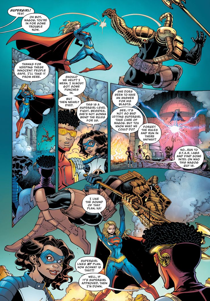 Sin embargo, incluso con la intervención de Supergirl en la lucha contra Magog, los planes del villano aún continúan. Durante el flechaverso crossover, Magog reunió a algunos villanos aterradores para detener la era de los héroes, incluidos Clayface, Kal-El de otra Tierra, un clon de la Aguja y Evil Eye. La vista previa termina con la revelación de quién es Magog mientras aumenta los ataques por toda la ciudad.