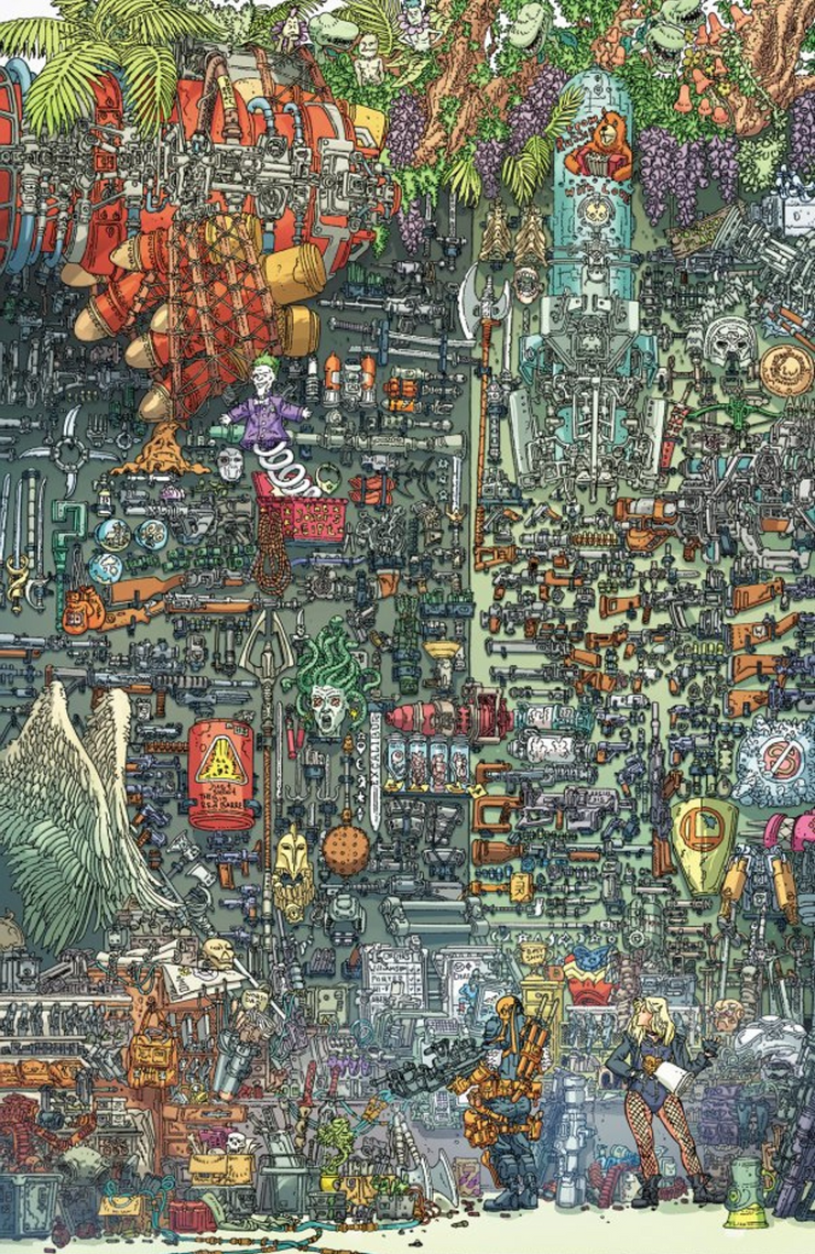 Mientras Golpe mortal ya es ampliamente considerado como uno de los mejores maestros de armas en el Universo DC, una nueva portada variante que muestra su arsenal lleva esto a un nivel completamente nuevo. La portada está dibujada en un estilo wimmelbilder, que es un estilo artístico que presenta muchos detalles diminutos para que el espectador los encuentre y los explore, comúnmente vistos en el ¿Dónde está Waldo? libros. La portada hace esto increíblemente bien, ya que está llena de referencias a armas de DC, tanto famosas como oscuras.