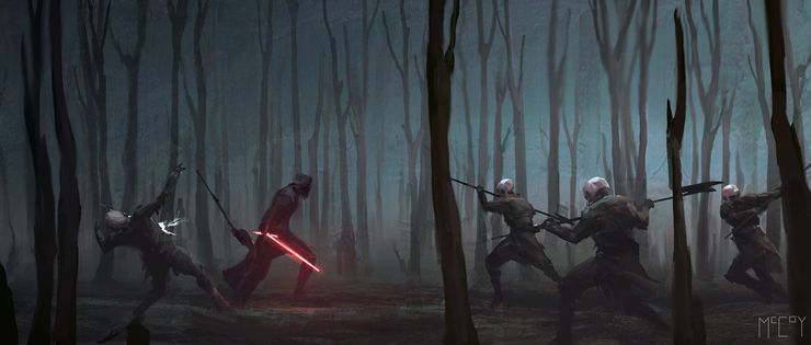 La versión final de la escena en el ascenso de skywalker, colocado al comienzo de la película, terminó siendo bastante breve. Junto con un escuadrón de soldados de asalto, la escena muestra a Kylo Ren atravesando a docenas de enemigos con su sable de luz en un bosque seco para obtener el Wayfinder de un altar de piedra cercano. Sin embargo, el viaje en el arte conceptual parece ser un asunto más prolongado. En el arte conceptual, Kylo Ren aterriza en la base de una montaña y camina hasta la cima, atravesando docenas y docenas de enemigos en su camino, antes de finalmente llegar al Wayfinder ubicado en una plataforma ritual en la cima de la montaña.