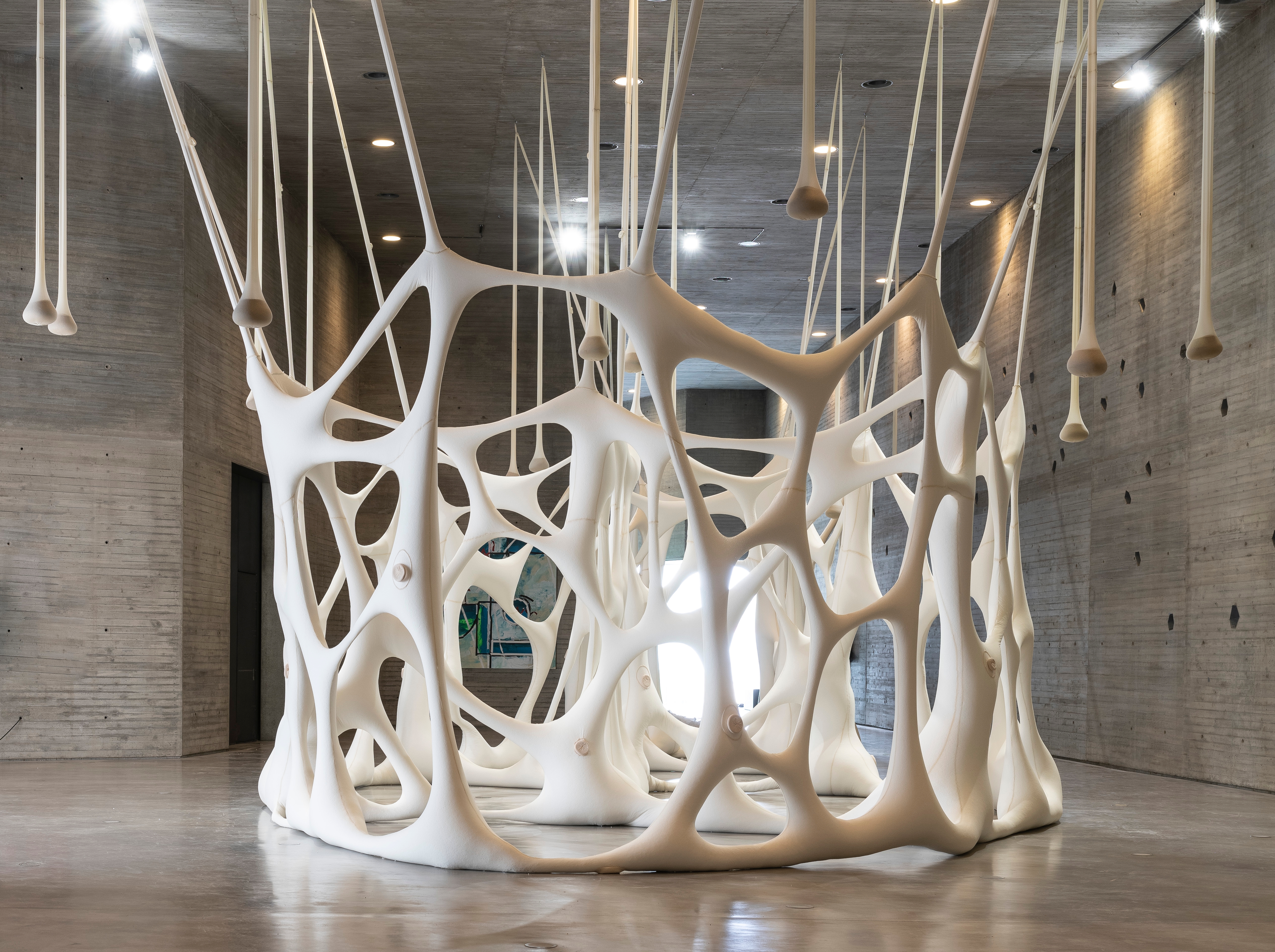 Las piezas del argentino Tomás Saraceno, creadas a partir de telas de araña, desvelan que con estas arquitecturas biológicas el animal genera en realidad una prolongación de su propio cuerpo. Y cuerpos híbridos o mutantes presentan las esculturas de Camille Henrot y Sarah Lucas: para esta última, la idea de la abundancia pasa por no tener que elegir entre sexos, al reunirse todos en una misma morfología. De lo liminal entre los cuerpos y los dispositivos diseñados para transportarlos tratan las dos obras monumentales de Teresa Solar, que forman parte del conjunto de cinco que la artista madrileña produjo para la pasada Bienal de Liverpool de 2021. Son las únicas piezas de la exposición que no fueron encargadas o adquiridas por la colección de Francesca Thyssen-Bornemisza.