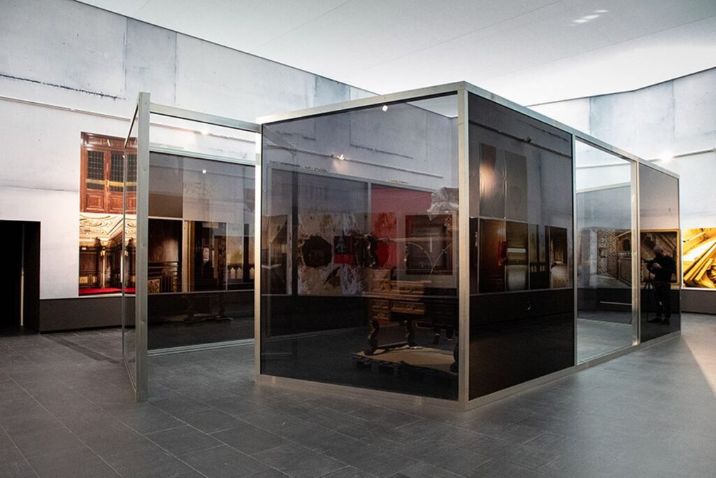 Por un lado está la sala en penumbra donde cuelgan las fotografías del viejo museo, superpuestas en capas en torno a la arquitectura efímera del estudioHerreros. Es un pabellón de vidrios y espejos opacos, que replica la forma del Salón de Reinos original y evoca los sucesivos museos militares y el proyecto de su futura ampliación. Dentro se amontonan algunos muebles Remordimiento del taller de carpintería de la cárcel de Ocaña: Perdices investigó y descubrió que los presos republicanos trabajaron en él para abastecer el museo de Franco tras la guerra. Los ha rescatado y traído hasta aquí para apilarlos como antimonumentos y reivindicar su memoria. Por otro, el libro excelentemente diseñado por This Side Up, con los textos muy trabajados de Jauá, Jiménez Blanco y Juan Herreros y una conversación franca a tres bandas de artista, comisaria y director. Y al final, de la suma de todo resulta el edificio mental y memorioso que el visitante se lleva en la imaginación: un museo de fantasmas y ecos que no podemos dinamitar ni borrar sin más de la memoria colectiva.