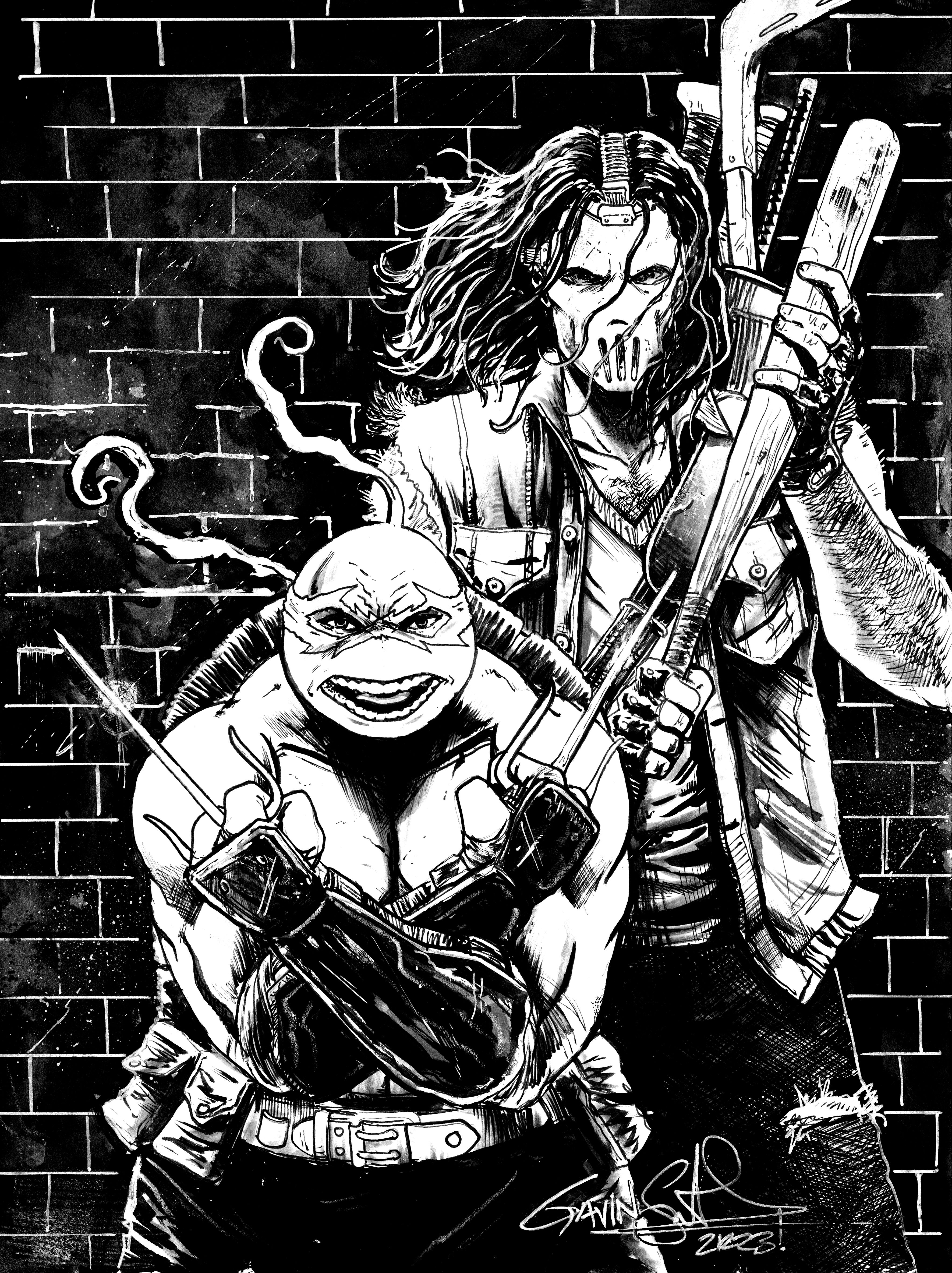 Gavin: Creo que el solo hecho de poder ser parte de esta serie es una gran contribución en sí misma. Estoy bastante seguro de que nunca antes se había arrestado a una tortuga y, aparte de una portada que hicieron Kevin Eastman y Sophie, pude dibujar la primera aparición de las seis tortugas juntas por primera vez. ¡Y están comiendo pizza!