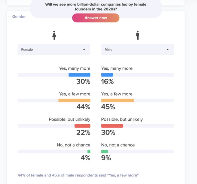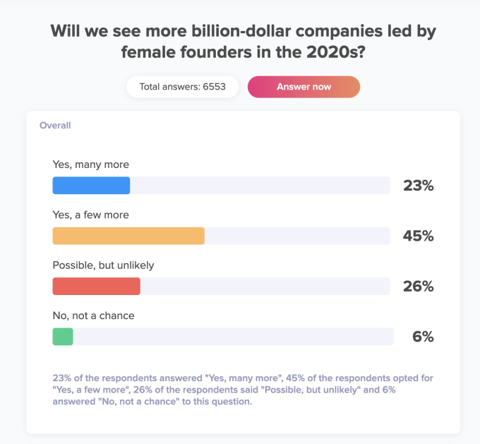 La opinión pública está de acuerdo. Junto con TruePublic, donde soy asesor e inversionista ángel, realicé un estudio preguntando si la gente creía que veríamos más unicornios liderados por mujeres en la década de 2020.6 6 En el momento de este artículo, el 68% de los 6.500 encuestados dijeron que creían que veríamos más, y el 30% de las mujeres respondieron “muchas más” (en comparación con solo el 16% de los hombres). Solo el 4% de las mujeres, pero el 9% de los hombres, respondieron “no, no es una oportunidad”.7 7