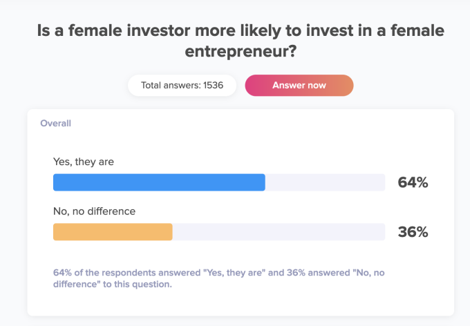 Mi estudio en TruePublic coincidió con estos hallazgos. Cuando se les preguntó si una mujer inversora tenía más probabilidades de invertir en una mujer emprendedora, el 64% de las personas respondieron afirmativamente (el 64% de estas personas eran mujeres y el 63% eran hombres).9 9