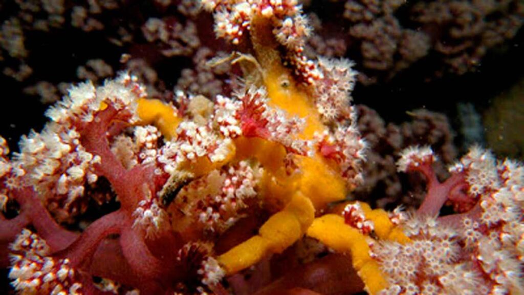 Conocido científicamente como Camposcia retusa, este llamativo animal recibe el apodo de cangrejo decorador. Un mote más que merecido, ya que como podrás apreciar en la fotografía, su fisionomía se basa en numerosas formaciones coloridas que le sirven para camuflarse de los depredadores. «Adornar» de tal forma su anatomía le ha hecho famoso en todo el mundo. Algo que consigue por medio de esponjas marinas, fragmentos de algas y todo tipo de objetos que encuentren en las profundidades marinas.