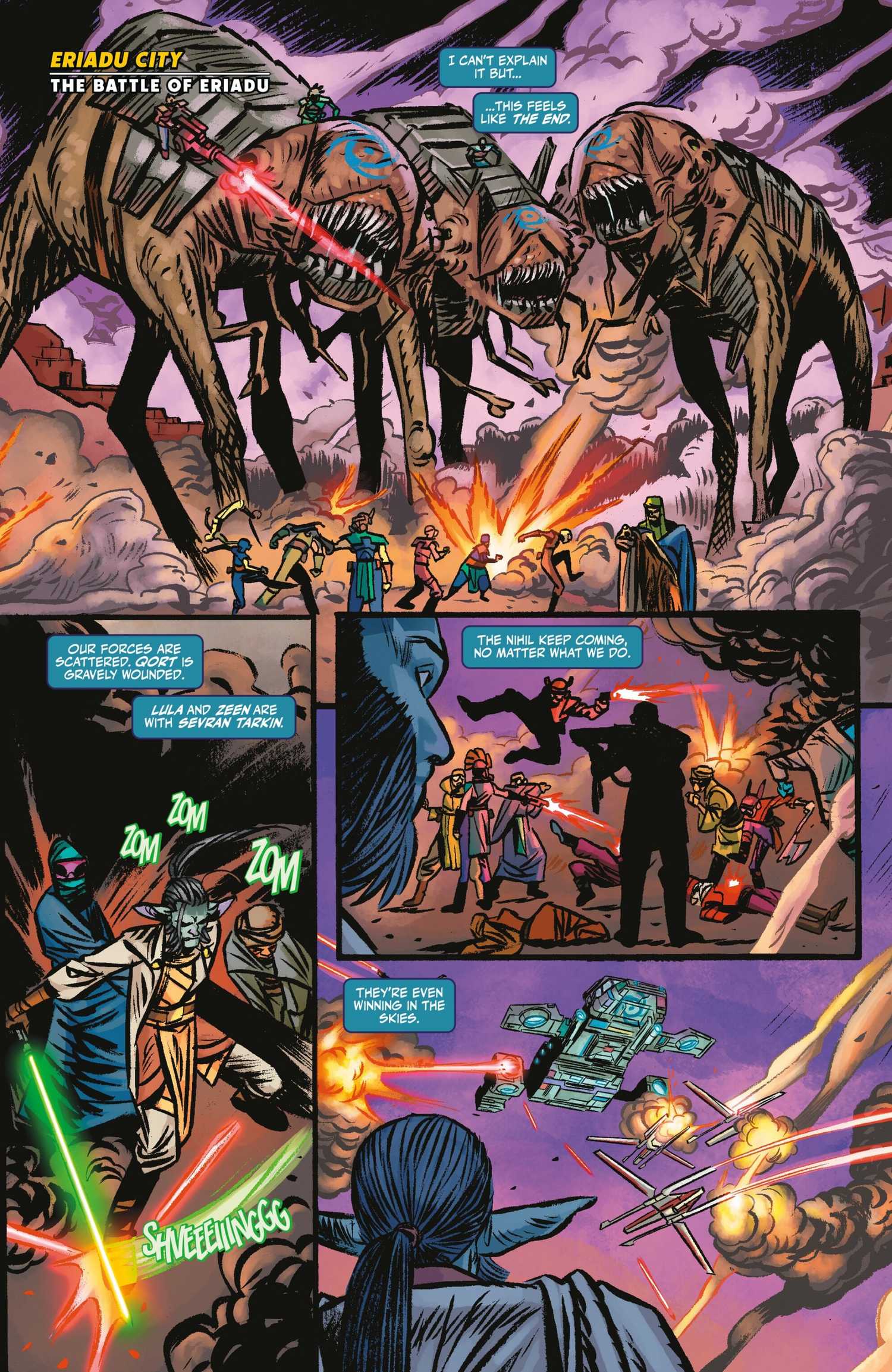 En Dark Horse’s New Star Wars: High Republic Adventures #15 Por Daniel José Old y Toni Bruno, la Batalla de Eriadu está en marcha, el mundo natal de la familia Tarkin y una base clave para la Coalición de Defensa de la República cerca de la región de la Galaxia reclamada por los Nihil Marauders. Jedi Knight Farazala Tarabal lidera la carga, unida por una variedad de piratas y compañeros Jedi, incluidos el Maestro Yaddle, Tera Sinube y más. Sin embargo, todavía están rivalizados por las fuerzas de Nihil en el suelo, en el cielo, así como por un contingente de merodeadores que conducen a la batalla en monstruosas criaturas imponentes: