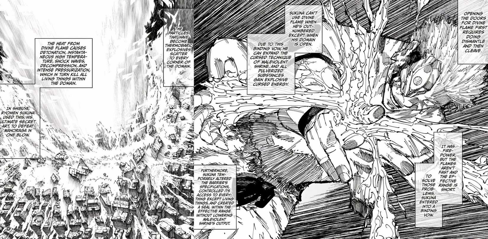 El capítulo 259 explica que a pesar de su potencia de fuego, Divine Flame carece de velocidad y tiene un pequeño alcance efectivo que Sukuna supera usando un voto vinculante para intentar derrotar a Yuji, Choso y los hechiceros restantes en el campo de batalla dentro de su dominio. El voto vinculante impide que Sukuna use la Llama Divina en múltiples objetivos a menos que esté dentro del Santuario Malévolo.