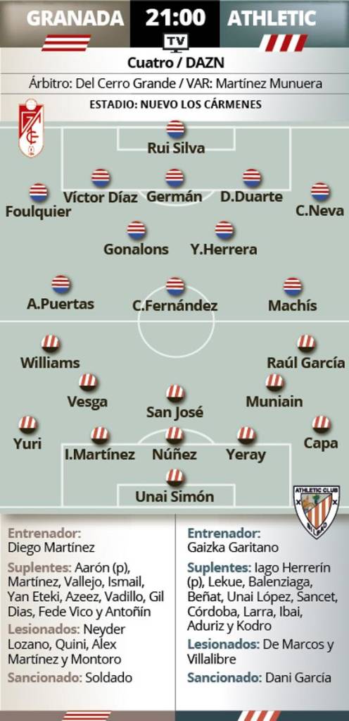 Ya quedó claro que Unai Simón también es el guardián del arco para la Copa, aunque al no haber jugado en los primeros cruces, el de Murgia no entra en el once de los más utilizados este curso por el Athletic en esta competición. Sí figuran en él Capa, Yeray, Núñez, Iñígo Martínez, Yuri, Dani García, Vesga, Muniain, Williams, Raúl García y Lekue. Por ahí podrían ir los tiros en Los Cármenes, con las ya citadas particularidades en la portería, en el pivote y restando a Lekue. Si optase por línea de cuatro atrás, el renacido Córdoba tendría sus opciones. Con todo.