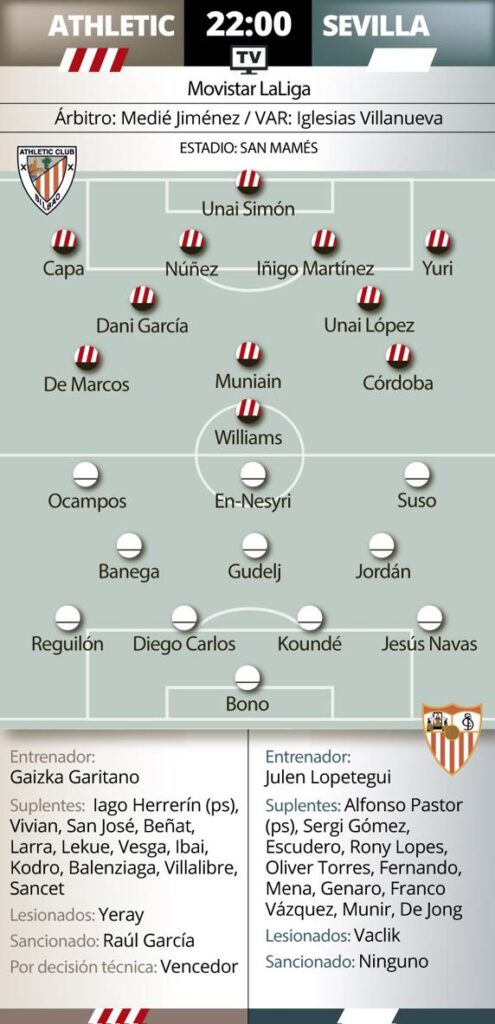 La otra alternativa tiene bastantes más variantes. Williams ocuparía el puesto de ‘9’ y la duda es si seguiría manteniendo a Muniain por detrás y Córdoba en el costado zurdo del ataque para meter un hombre de banda derecha, que podría ser De Marcos, Ibai o Larra, o se decanta por alinear de inicio a Sancet.