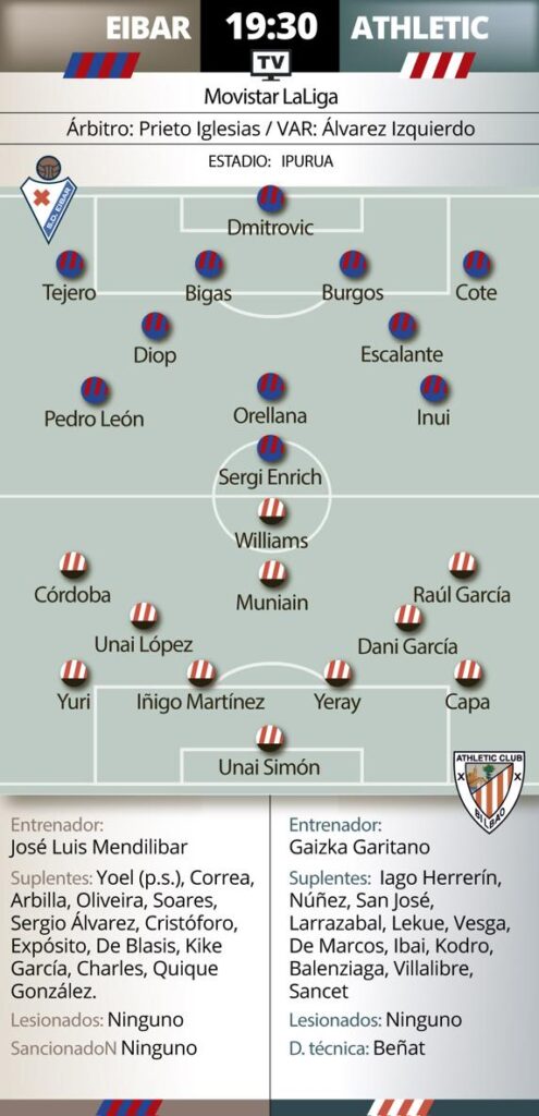 El Athletic tiene cita en un escenario habitualmente agradecido para sus intereses a la vista de los resultados que ha venido cosechando. Se mide a un Eibar (19:30 horas, con arbitraje de Prieto Iglesias) que está colgado de un alambre y con visos de poder caerse si el viento sopla fuerte. Sin el empuje de su gente, además, puede ser un rival más vulnerable, un nuevo ejemplo para ratificar la tendencia germana de que sin afición los equipos visitantes tienen más opciones de rascar. Hace unos meses la Real ya sacó tajada en Ipurua de un duelo a puerta cerrada.