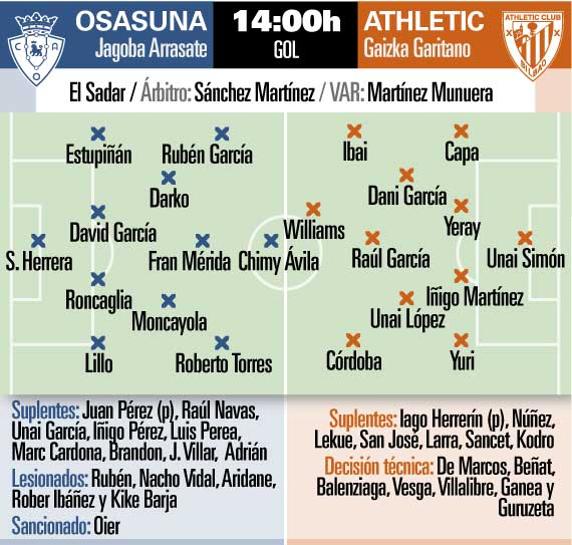 Otra opción es situar a Sancet en la media punta, dejando a Raúl como nueve y a Williams en la derecha. Pero el joven navarro aún no se ha estrenado en un once. Y no habría que descartar la alternativa de que el deriotarra opte por poblar el centro del campo, teniendo en cuenta que el partido es fuera de casa, y adelante a Unai López para que San José y Dani García ejerzan en el doble pivote. Habrá que esperar hasta que el Athletic ofrezca la alineación.