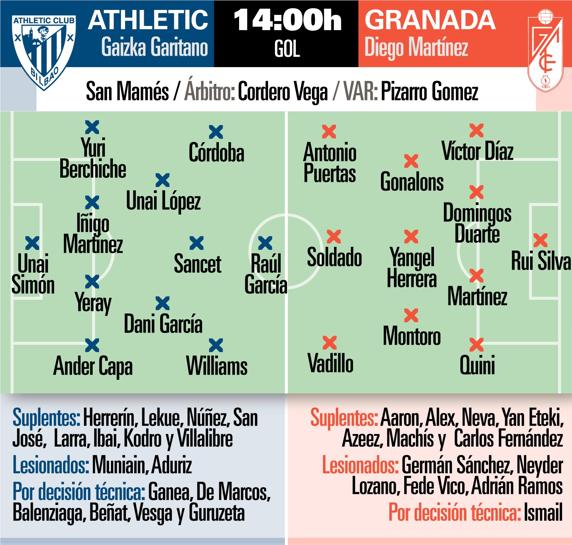 Diego Martínez cumplirá en Bilbao el primero de los dos partidos con los que ha sido sancionado, de modo que seguirá las evoluciones desde el palco. El Granada tiene una ausencia importante en el eje defensivo: Germán. El goleador contra el Atlético sufre una rotura muscular. Su puesto apunta a ser ocupado por José Antonio Martínez. Adrián Ramos, Neyder Lozano y Fede Vico tampoco han viajado a Bilbao al estar lesionados. Soldado parece que será la punta de lanza de los nazaríes. Mucha experiencia a disposición de los suyos, aunque solo lleva un gol en este ejercicio.