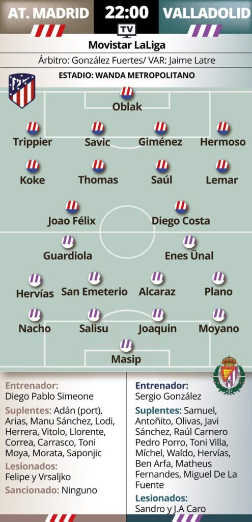 Hora de la confirmación para el Atlético de Madrid. Después de golear el miércoles en Pamplona, reencontrarse con la victoria a domicilio, dejar su puerta a cero lejos del Metropolitano, y de que jugadores como Koke, Joao Félix o Llorente dieran un paso al frente, es momento de corroborarlo en cada frente al Valladolid.