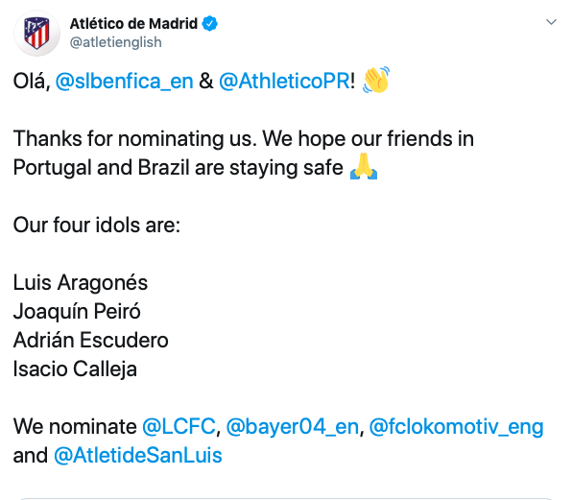 Esta es una de las múltiples iniciativas que se están viendo por las redes sociales en las últimas semanas de confinamiento por la crisis del Coronavirus. Un juego en el que las personas debían señalar a los cuatro ídolos que le habían marcado, el juego ha ido evolucionando hasta llegar a los clubs de fútbol. El Atlético de Madrid de este modo ha respondido a la pregunta que le han lanzado tanto el Benfica como el Atlético Paranaense. Por su parte han nominado a otros cuatro equipos como son el Liverpool, el Bayer Leverkusen, el Lokomotiv y el Atlético San Luis. Tres equipos a los que se han medido en Champions y a su ‘hermano pequeño’ de México.