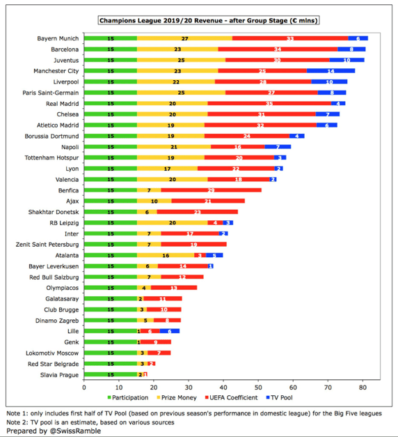 El Bayern sería el que más dinero lleva ingresado, con 82 millones, seguido por Barça (81), Juventus (80), Manchester City (78), Liverpool (76), PSG (75), Real Madrid (75) y Chelsea (73), empatado con el Atlético (73).