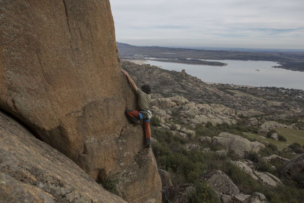 En el risco de Gusarapo, el más cercano a la población de Manzanares El Real, uno de los escaladores desciende con una cuerda azul por la pared de piedra inclinada. “Tensa, que voy hacia abajo”, le ordena a su pareja de actividad que asegura la maniobra. Los rayos de un sol radiante y el cielo despejado posibilitan el disfrute de las vistas desde este lugar privilegiado de masas graníticas. Los amantes de la escalada llegan totalmente equipados: pies de gato, arnés, cuerdas, cintas y cascos. Tampoco faltan los aseguradores (conocidos como grigris), que sirven para detener una posible caída.