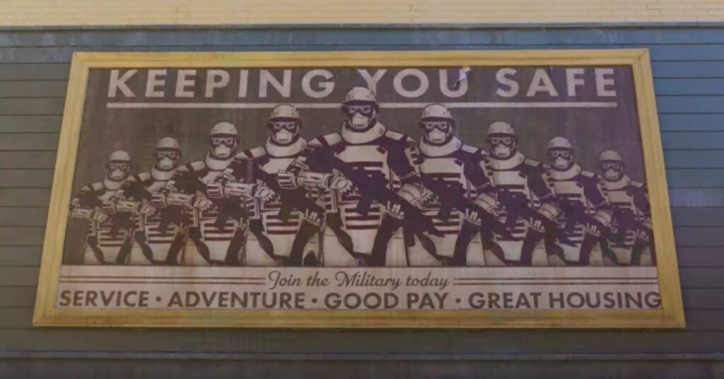Otra mirada dentro de los muros del Commonwealth insta a sus ciudadanos a unirse al Commonwealth Army para disfrutar de beneficios como un buen salario y una excelente vivienda.