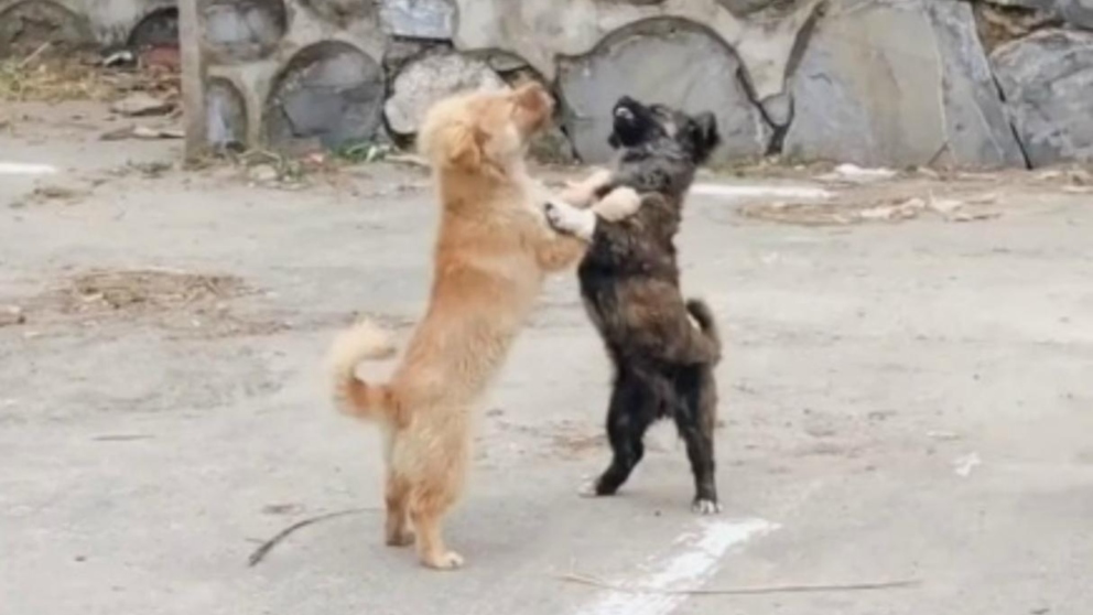 La escena podría ser una más de la vida de unas mascotas. Dos hermanos que se pelean bajo la atenta mirada de su madre. Los dos perros emprenden el control territorial haciendo algo inesperado, se ponen de pie para poder utilizar mucho mejor las patas delanteras. Parecen dos bailarines en medio de una canción lenta que se mueven al son de la música.