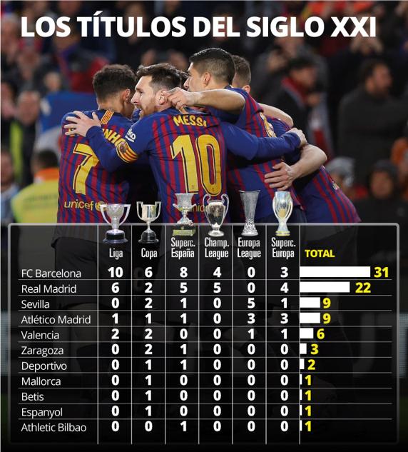 Sus 31 títulos desde 2001 superan claramente los 22 de su inmediato perseguidor, el Real Madrid, a pesar de que los blancos han ganado un trofeo más de campeón de Europa. En los tres trofeos del fútbol español –Liga, Copa y Supercopa-, el ‘marcador’ es de 24-12 a favor de los blaugrana.