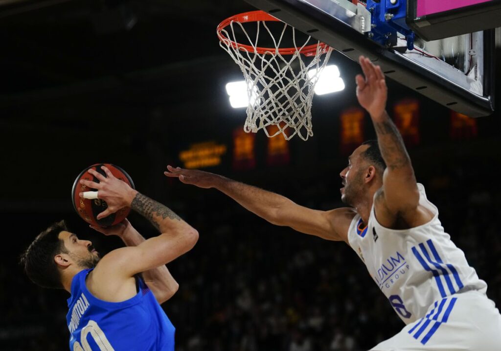 Un cruce de caminos entre los dos grandes que se escenificó más en el resultado que en el juego. Esta vez el clásico fue un pulso apretado, con muchos puntos y poca defensa, con más equilibrio que vaivenes. Y con polémica, como mandan los cánones, con la descalificación de Mirotic y Abalde tras un encontronazo en media pista y, sobre todo, con una falta de Poirier sobre Sanli (a falta de ocho décimas), en la lista de agravios de los blancos. Esa falta, en el forcejeo entre los dos pívots, dio pie al empate azulgrana rumbo a la prórroga cuando el Madrid creía haber capturado el rebote del triunfo. Los de Laso se defendieron firmes, con una rotación de 10 piezas, y se agarraron con determinación al encuentro pese a verse dos veces descolgados. Pero se quedaron sin depósito en el tiempo extra. Justo cuando emergió la fibra y la puntería de Exum y Hayes (9 puntos en el tramo decisivo) para resolver la intriga con un parcial de 19-8 que puso en valor lo construido por Laprovittola (20 puntos) y Smits (18).