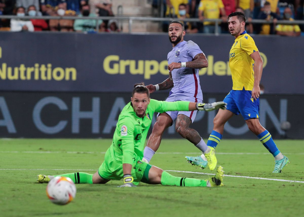 Koeman quitó al inocuo Demir y puso a Sergi Roberto sin que apenas se enterara nadie porque fue el Cádiz quien rondó el gol con un tiro de Negredo que sacó Ter Stegen. Había mucha energía en el plantel amarillo y demasiada lentitud en el Barcelona hasta que compareció Memphis. A una pifia sobrecogedora en un remate aparentemente sencillo le siguió un tiro del neerlandés que exigió la respuesta de Ledesma. La contienda despertó por momentos, el campo se abrió y los dos equipos empezaron a intercambiar ataques sin que nunca atinara a intervenir Luuk de Jong. La mejora no les alcanzaba a los barcelonistas para abatir al Cádiz. La discutible expulsión de De Jong acabó con el ímpetu del Barcelona.