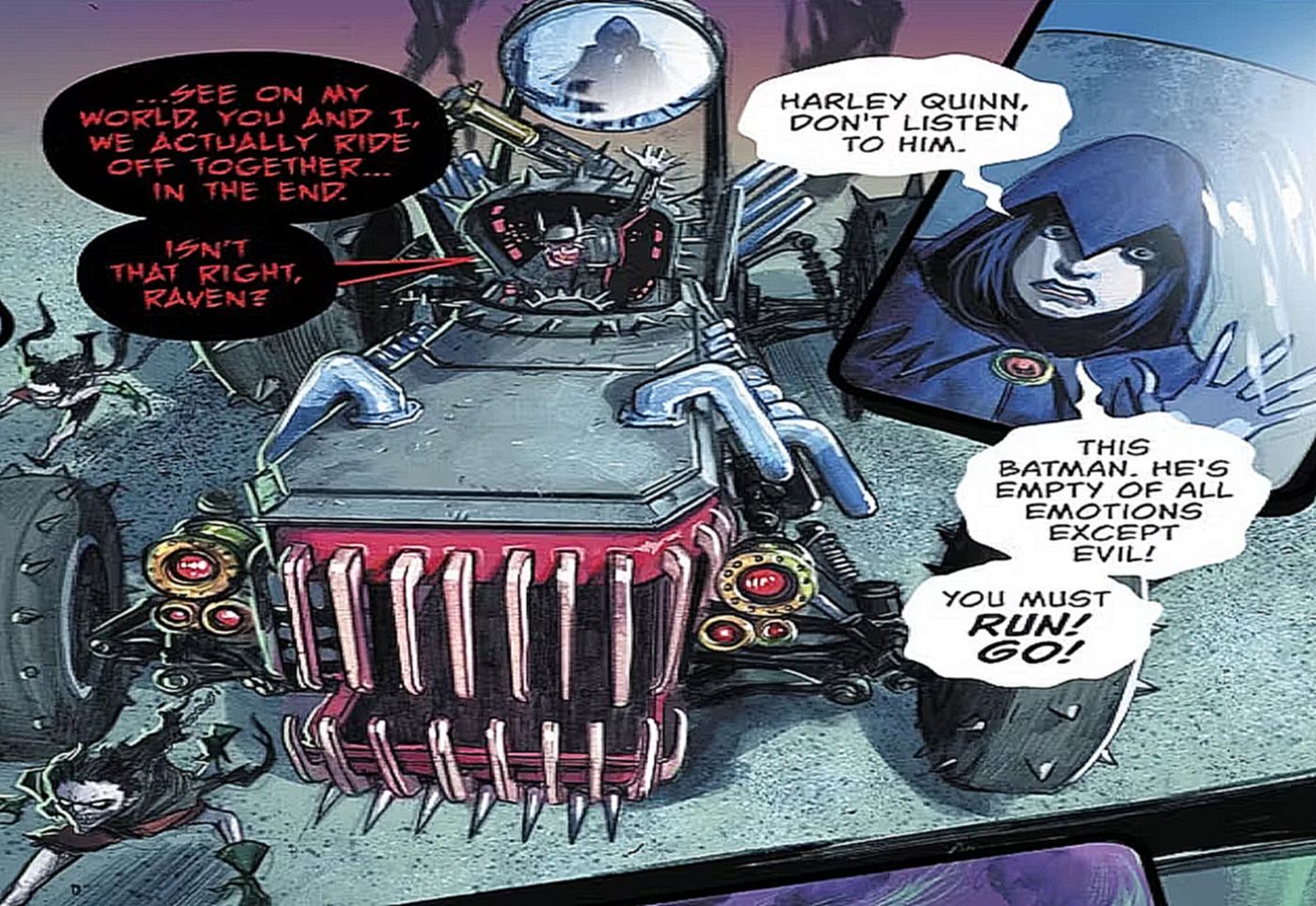 Batman Who Laughs es una de las creaciones más evocadoras de DC, visual y conceptualmente, respondiendo a la pregunta de qué pasaría si una versión de Batman se rompiera, hasta el punto de convertirse en el Joker. Flecha verde #32 llevó esto al siguiente paso lógico, introduciendo una versión retorcida del Batimóvil que los Batmen de todo el Multiverso DC detestarían por su malévola apropiación indebida de Bat-tech. Al igual que su creador, el Batimóvil que ríe es una amenaza caótica para cualquier universo que habite. Además, es demasiado emocionante para los futuros creadores de DC como para no querer hacer más con él.