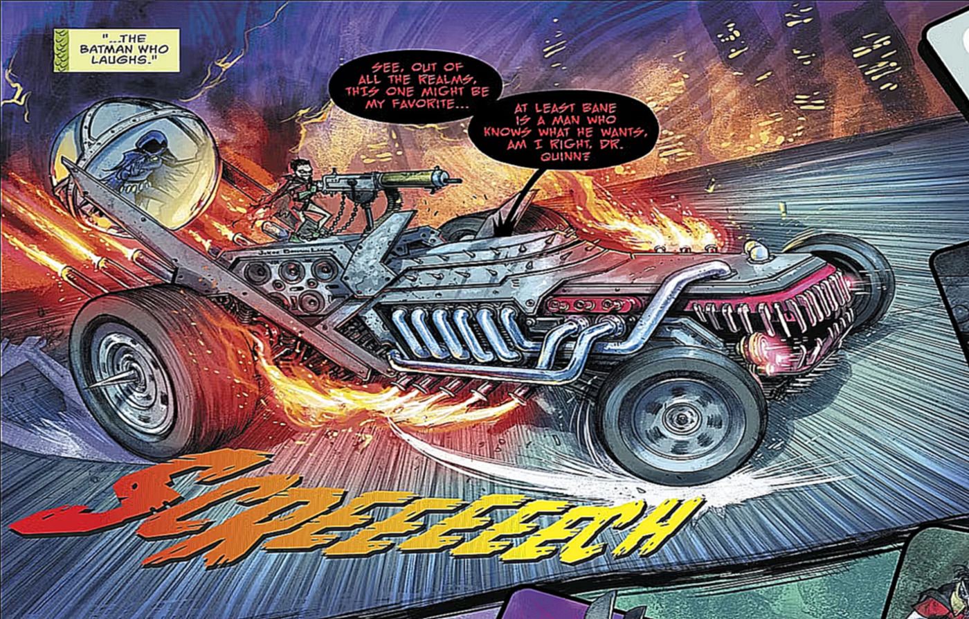 Cuando una colación de versiones malvadas de Batman de diferentes realidades comenzó a intentar llevar a la Tierra al Multiverso Oscuro, el Universo DC se sumió en la confusión. El líder de los antagonistas, Batman Who Laughs, perseguía cualquier resistencia en su “Batmóvil que ríe”.
