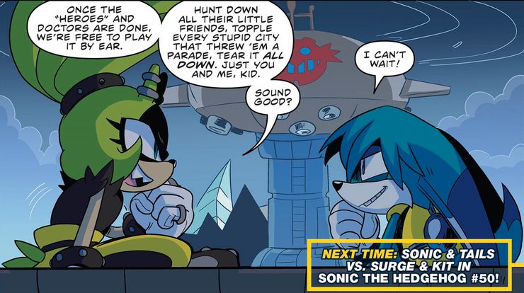 Ahora Sonic the Hedgehog: síndrome del impostor #4, escrito por Ian Flynn con arte de Thomas Rothlisberger, ha preparado el escenario para Sonic El número 50 llegará el próximo mes de la mano de Flynn y el artista Adam Bryce Thomas. Recientemente, Surge y Kit ayudaron al Dr. Starline a apoderarse de la ciudad de Eggman, ya que Starline usa una poderosa baliza para llamar a todos los Badnicks de Eggman para lanzar una guerra contra Sonic y sus amigos. Desafortunadamente para Starline, Eggman no solo puede escapar y ahora está lanzando su contraataque contra el traidor, sino que las propias creaciones de Starline, Surge y Kit, planean volverse contra él una vez que hayan derrotado a Sonic y sus amigos. Además de esto, Sonic, Tails y la hija del Dr. Eggman, Belle the Tinkerer, se dirigen directamente a esa misma ciudad sin el conocimiento de todas las partes antes mencionadas. Starline ni siquiera ha tenido tiempo de comenzar su ataque a Sonic, y Eggman ya está preparado para devolver el golpe a Starline, posiblemente con Metal Sonic.