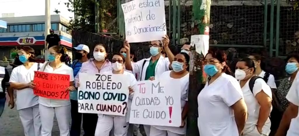 “Zoé Robledo: ¿el bono Covid para cuándo?”, fue una de las preguntas que lanzó personal de enfermería del Hospital Regional número 1 de Cuernavaca del Instituto Mexicano del Seguro Social (IMSS) durante una manifestación con la que exigieron mejores condiciones para atender a pacientes contagiados de coronavirus y que las incapacidades del personal que se ha contagiado del virus se dé por riesgo de trabajo y no por enfermedades generales.