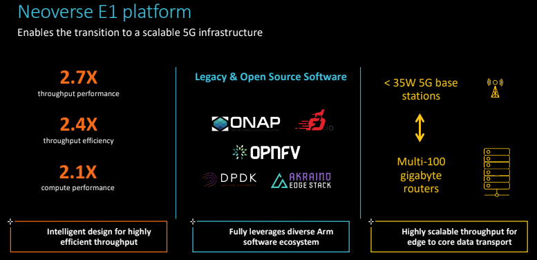 La plataforma Neoverse N1 está diseñada para soluciones de clase de infraestructura que se centran en la velocidad de procesamiento sin procesar. Los chips deberían tener un rendimiento significativamente mejor que las generaciones anteriores de CPU de armado para el centro de datos y la compañía dice que vio aceleraciones de 2.5x para Nginx y MemcacheD, por ejemplo. Los fabricantes de chips pueden optimizar la plataforma de 7 nm para sus necesidades, con conteos de núcleos que pueden alcanzar hasta 128 núcleos (o tan solo 4).