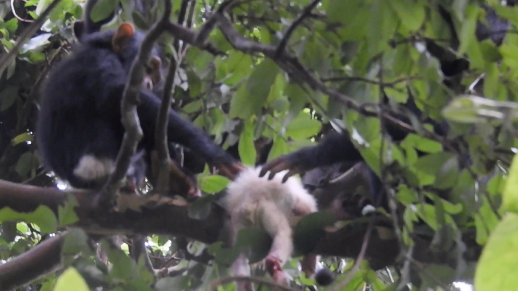 Este examen cuidadoso y repetido del cadáver por parte de crías y adultos no parece un comportamiento típico, explica por email Maël Leroux, testigo de los hechos y principal autor del estudio. Un macho usó sus labios para probar el pelo blanco de la cría y varios individuos se lo acariciaron, claramente interesados por la textura de ese pelaje, que solo han visto en unos pequeños monos a los que a veces cazan por la zona. “En anteriores observaciones, menos sujetos inspeccionaron el cadáver, durante menos tiempo, a menudo solo la madre”, añade Leroux, de la Universidad de Zúrich.