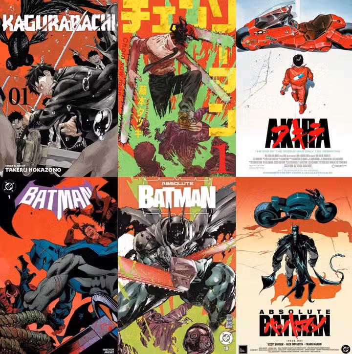 Los fanáticos del anime que siguen los lanzamientos de Batman de DC también habrán reconocido otros tributos inspirados en el manga durante el último año, incluida la portada variante de Dan Mora para Ordenanza #1 (2025), que hace un guiño a Takeru Hokazono Kagurabachi (2024), y una portada de tercera impresión para Batman absoluto #1 de Javier Fernández que rinde homenaje a la icónica película anime de ciencia ficción akira (1988).