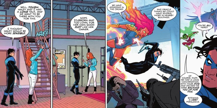 Ahora, Ala Nocturna #88 ve a Dick decidido a continuar con su trabajo, como inaugurar públicamente la Fundación Alfred Pennyworth, independientemente del peligro que pueda ponerlo. Cuando Barbara señala que Dick siempre pone a todos primero antes que a sí mismo, también hace el comentario hilarante de que ella y Haley “hablaron” y decidieron que estarían allí para asegurarse de que se mantuviera a salvo. Sin embargo, el problema se duplica en la adorable broma cuando se revela que los Titanes han sido llamados como respaldo, con Chico Bestia comentando sobre el poder persuasivo de Bitewing, habiendo “reunido” a todos los héroes para mantener a Grayson a salvo.