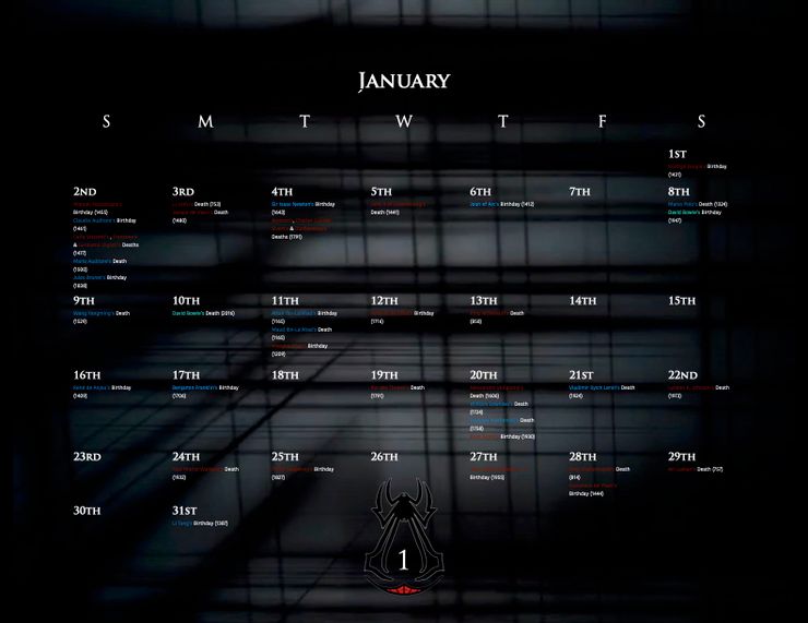 Un fan de Assassin’s Creed ha creado un calendario que enumera los nacimientos y muertes de los diversos personajes históricos y ficticios de la franquicia.