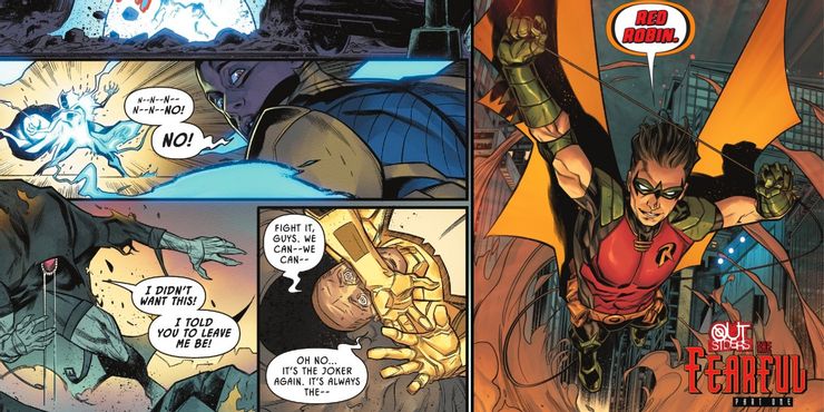 En Batman: Urban Legends # 8“The Fearful” (de Brandon Thomas, Cian Tormey, Raúl Fernández, Alejandro Sánchez y Steve Wands), Tim no solo se refiere a sí mismo como Red Robin, sino que parece ser inmune a The Fearful, un individuo que llena cualquiera que se acerque al terror alucinatorio, habiendo sido armado por el Espantapájaros. Cuando Duke persigue al Temeroso, él, como el resto de su equipo, ve a un enemigo aterrador, pero el cómic termina con Tim Drake saltando para ayudar, aparentemente inmune a los poderes del Temeroso. Es posible que simplemente aún no esté dentro del alcance, pero su entrada heroica implica que está trayendo algo nuevo a la mesa que el resto de los Forasteros altamente entrenados no pueden, y los anteriores.Nuevo 52 Detective Comics # 820 puede explicar qué es eso.