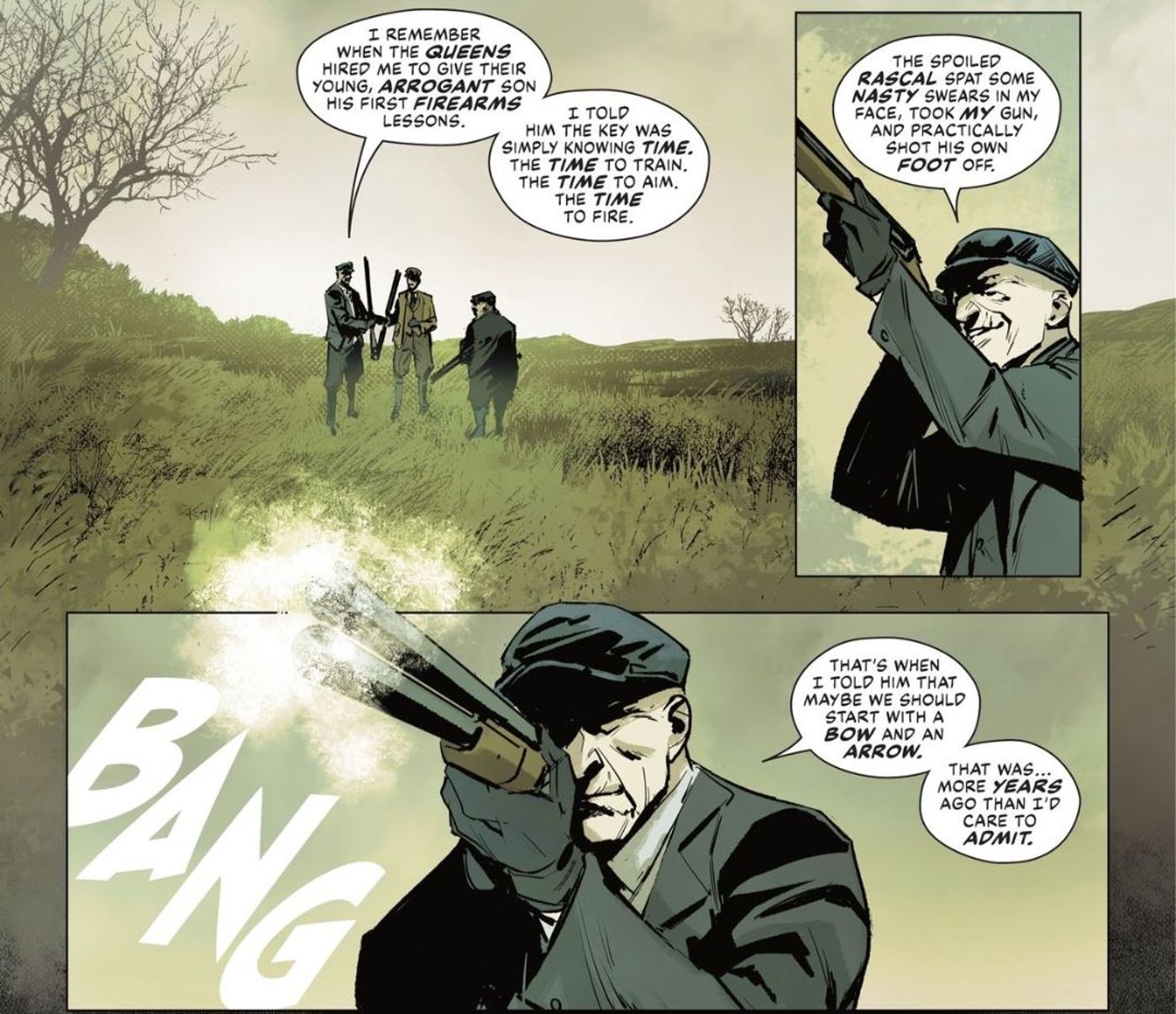 En El pingüino #2 Por Tom King y Rafael De Latorre, el gobierno de los Estados Unidos ha ordenado a Oswald Cobblepot que reconstruya su imperio criminal en Gotham para que el gobierno pueda controlar el elemento criminal de la ciudad. Para ayudarlo en su esfuerzo, el Pingüino busca a su antiguo socio, la Ayuda. The Help no tiene ningún interés en ayudar a Cobblepot, pero considera brevemente la idea. Mientras dispara armas, Help revela que uno de sus empleadores anteriores era la familia Queen y que intentó enseñarle a un joven Oliver a disparar con armas. Después de que Oliver estuvo a punto de perder el pie, el Ayudante sugirió que en su lugar entrenaran en tiro con arco.