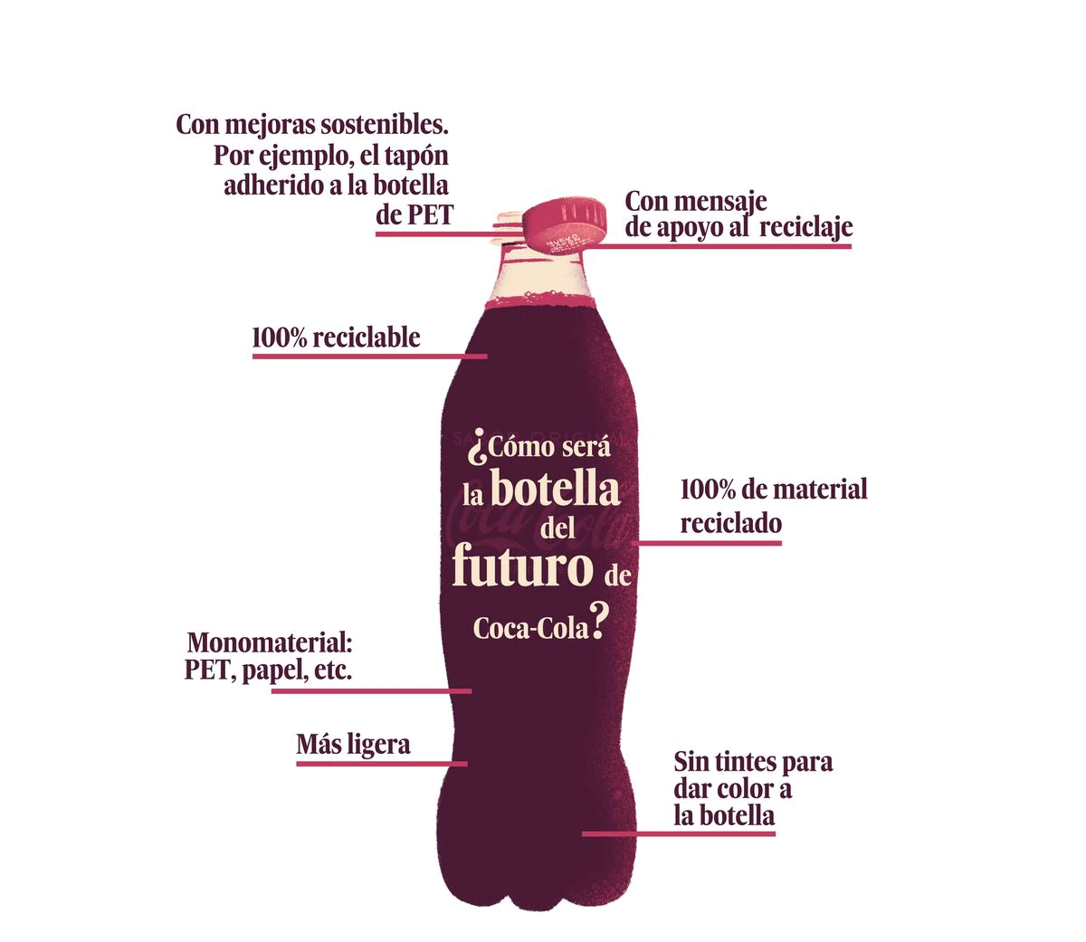 La botella del futuro será reciclable y tendrá múltiples vidas. En su composición se usará cada vez más material recuperado: Coca-Cola estima que el año que viene la mitad de sus envases de plástico estarán fabricados con material reciclado. Para los próximos años, además, se ha propuesto reducir aún más el uso de plástico virgen y trabajará para que sus envases se produzcan enteramente con PET -tereftalato de polietileno, uno de los plásticos más comunes para el envasado- reciclado, un compuesto que conlleva un 70% menos de huella de carbono respecto al de origen fósil.