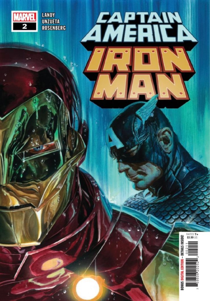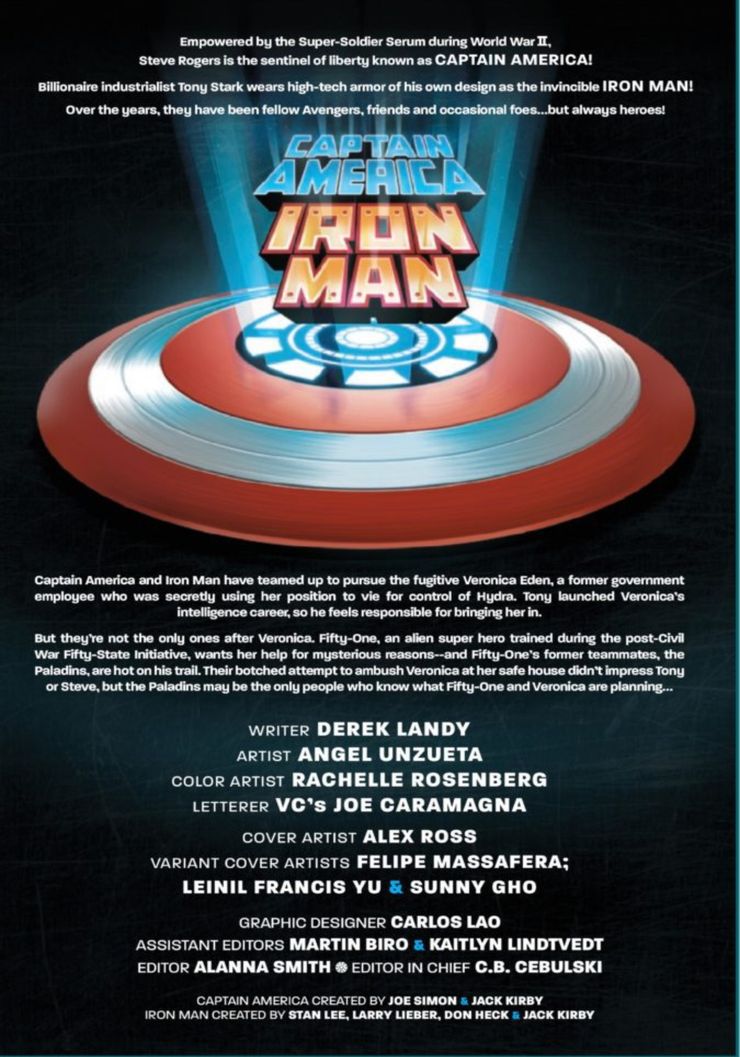 En una nueva vista previa de Capitán América / Iron Man # 2 (Mono H / TLuchaRobots) por Derek Landy, Angel Unzueta, Rachelle Rosenberg, Joe Caramagna de VC y Alex Ross, el Capitán y América tienen una conversación entrañable sobre ser héroes mientras persiguen a Veronica Eden. La pareja habla sobre la Iniciativa de 50 Estados que surgió de los eventos de Guerra civil y el Capitán América admite que no le desagradó la idea de que los superequipos se extendieran por todo el país, pero no le gustó el aspecto patrocinado por el gobierno.
