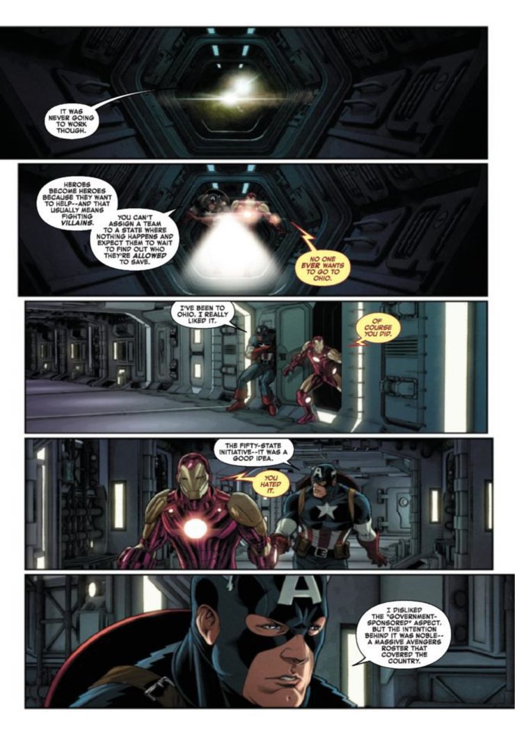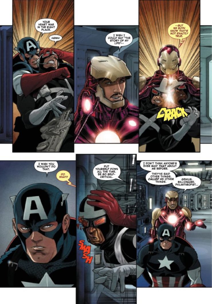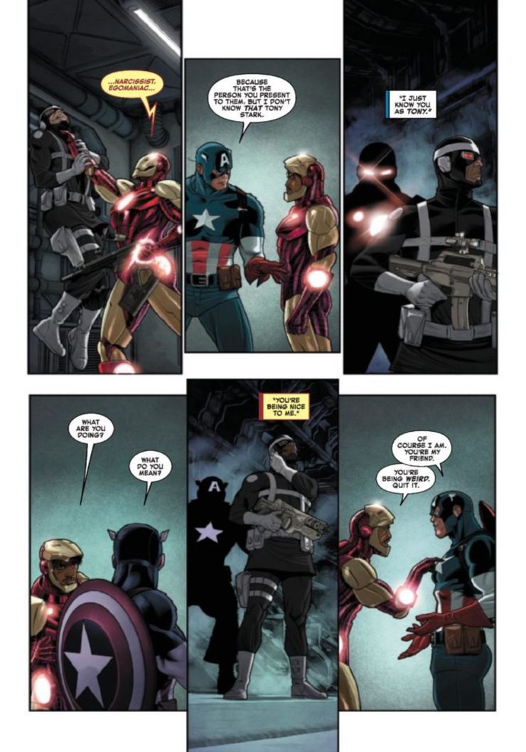 El Capitán América le dice a Iron Man que su corazón estaba en el lugar correcto con la iniciativa, pero cuando su compañero héroe comienza a criticarse a sí mismo, Cap le dice que se detenga. Stark dice que la gente lo conoce como un “ególatra y narcisista”, pero Rogers le dice que conoce al verdadero Tony, y que no es él. Iron Man le pregunta por qué está siendo amable y el Capitán América le dice: “Por supuesto que lo soy. Eres mi amigo”. Tony rápidamente señala que Steve está siendo raro y le pide que “deje de hacerlo”. La interacción es sinceramente adorable.