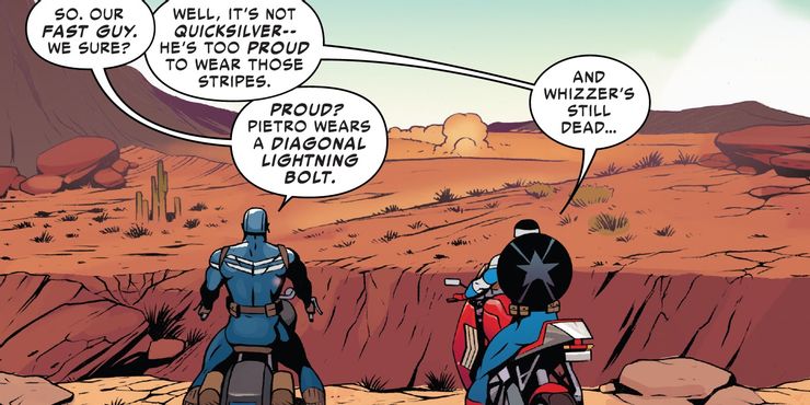 Siguiendo al velocista por el árido paisaje del norte de Nuevo México, Steve y Sam terminan perdiendo al villano, solo para decidir de inmediato que tendrán que dirigirse a Kansas para reunirse con otro asociado de Captain’s Network, un miembro de la Tribu Kickapoo. llamado Joe Gomez. Pero antes de hacerlo, ambos Caps tienen una discusión rápida sobre qué villano los está aterrorizando actualmente, llamando inadvertidamente una parte del disfraz de Quicksilver que simplemente no está a la altura en el proceso.