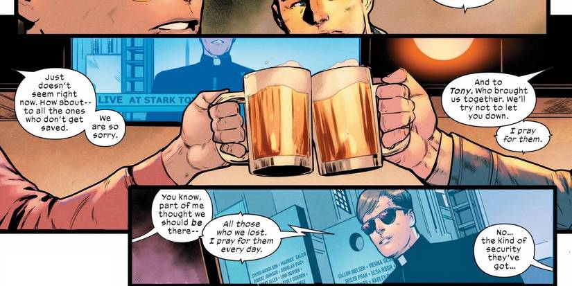 Después de la batalla en la que Tony Stark fue asesinado después de que Hulk, impulsado por un Puño de Hierro, lo aplastara vivo, en este número, Steve Rogers y Jim Hammond vestidos de civil arrojan uno en un viejo bar que Steve frecuentaba cuando era joven. Cansados y desilusionados por lo que ha sucedido recientemente, la pareja reflexiona sobre por qué pueden brindar ahora que los “nuevos comienzos” no están en las cartas. Primero brindando por “todos los que no se salvan”. Steve agrega: “Y a Tony. Quien nos unió. Intentaremos no decepcionarte”, diciéndole lo que nunca pudo decirle a Iron Man en el MCU.