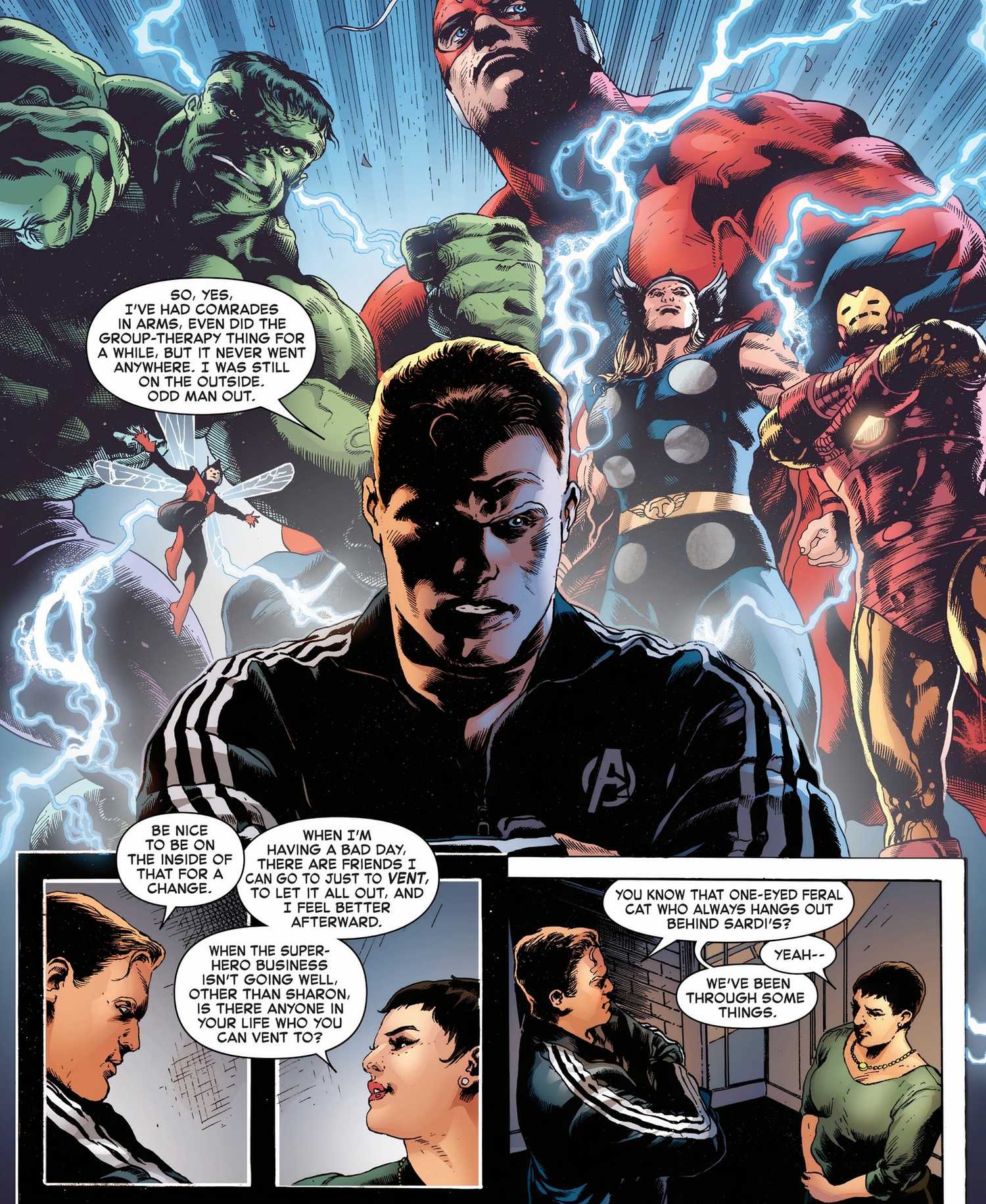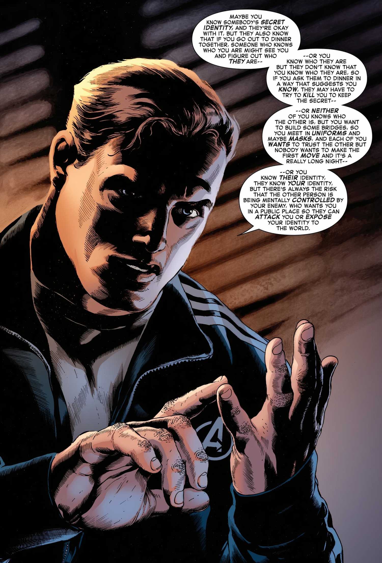 El concepto de “superhéroe” y el de “identidad secreta” están intrínsecamente ligados gracias a héroes como Spider-Man que guardan de cerca su vida real. Las identidades secretas son complicadas de mantener y el lamento del Capitán América revela su daño potencial. Cada combinación posible de compartir o conocer la identidad secreta de otra persona tiene complicaciones, a juzgar por la extensa explicación de Steve, y todo eso hace que sea difícil para los Vengadores forjar amistades más profundas con sus compañeros de equipo y aliados. Hay muchas personas en las que Steve confía para respaldarlo en una pelea, sin embargo, lamentablemente son pocos los que salen a cenar y hablan como personas reales.